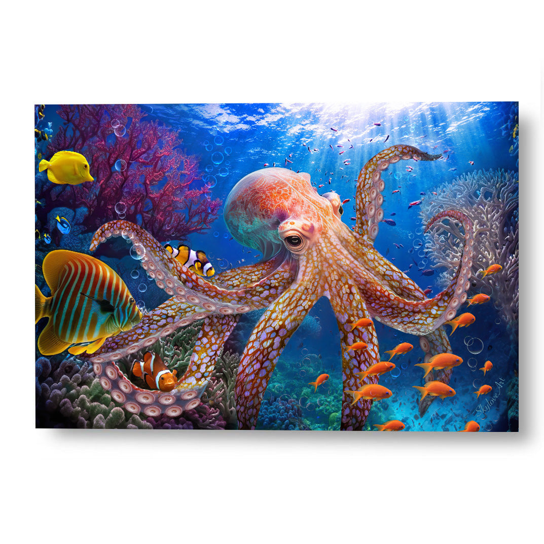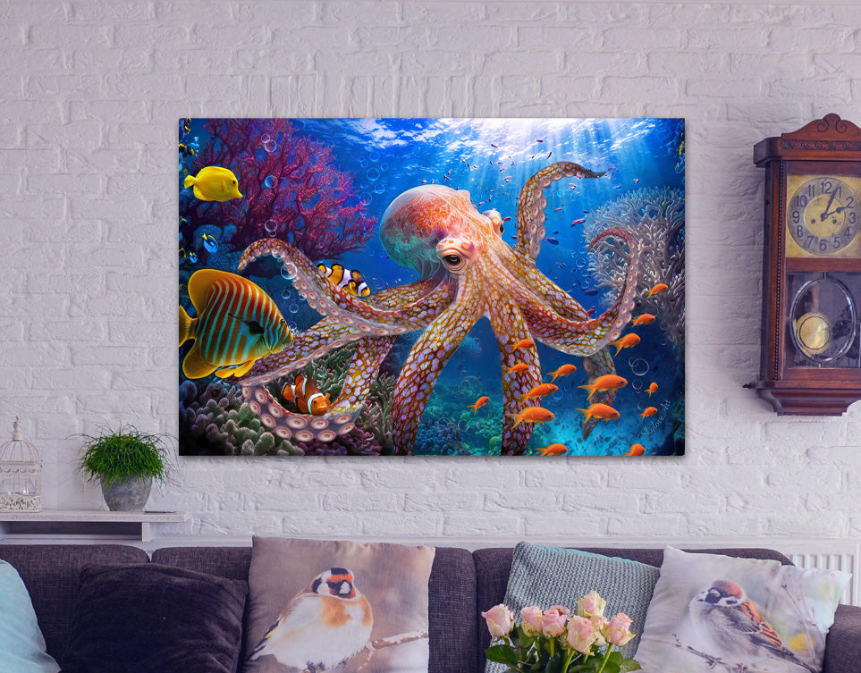 A colorful design showing an octopus in crystal clear waters, vibrant coral reefs, and tropical fish. Octopuses are truly magical creatures, with the ability to change the color and texture of their skin, as well as to blend in with their surroundings. They are known for their intelligence and problem-solving abilities, in addition to their physical abilities.