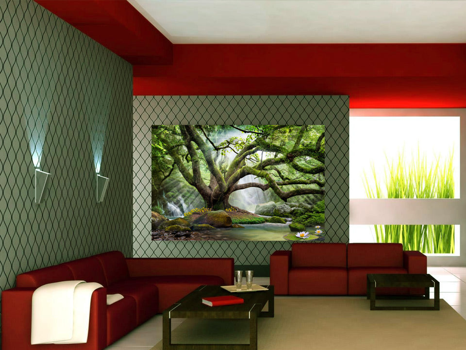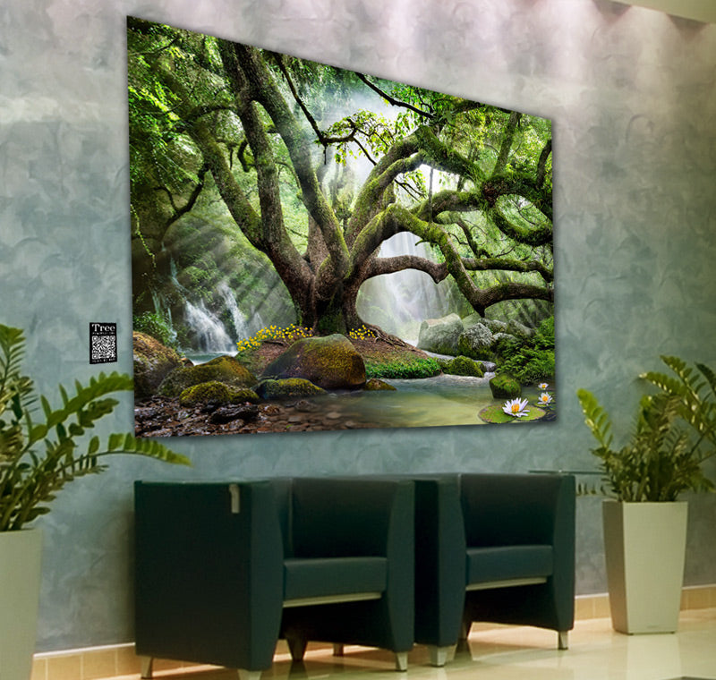 An ancient tree deep in a lush jungle, surrounded by waterfalls and rivers with rays of light shining through. This piece is rich with green and brown colors, emanating earthy, calming, grounded and rejuvenating energy.