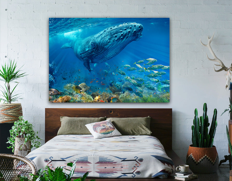 A whale diving in the ocean. Playful and dynamic, this piece brings about a sense of mystery and adventure.